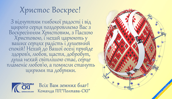 Шановні клієнти та партнери! Колектив компанії "Полтава-СКІ" вітає вас зі святом Пасхи! Христос воскрес!